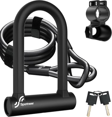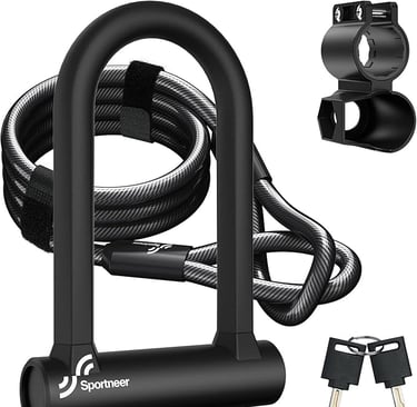 Sportneer Bike Lock: Heavy Duty Anti Theft Bike U Lock with 5ft Security Steel Cable - 17mm Shackle Bicycle U-Locks with Keys & Sturdy Mounting Bracket for Road, Mountain, Electric & Folding Bike