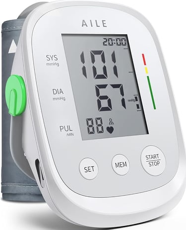 [Easy-to-Use and Read Blood Pressure machine] The AILE blood pressure monitor features a simple design - just put on the cuff, press the start button, and it works automatically, making it easy and fast to use. With a large LED electronic screen, bold fonts, and a screen angle designed for optimal viewing, it offers a very comfortable reading experience. AILE blood pressure machine is accessible for elderly people to use and read without any obstacles.