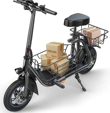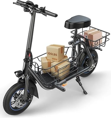 Ample Storage and Comfortable Deck: The electric scooter with seat features a large detachable middle basket and a small rear basket, offering convenient storage for bulky items and groceries. The 9.5" wide deck provides extra room for your feet or even a small pet, making it versatile for various needs.