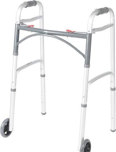 Wheeled Walker: Designed for safety and convenience, this rolling walker features push-button mechanisms that may be operated by fingers, palms, or even the side of the hand